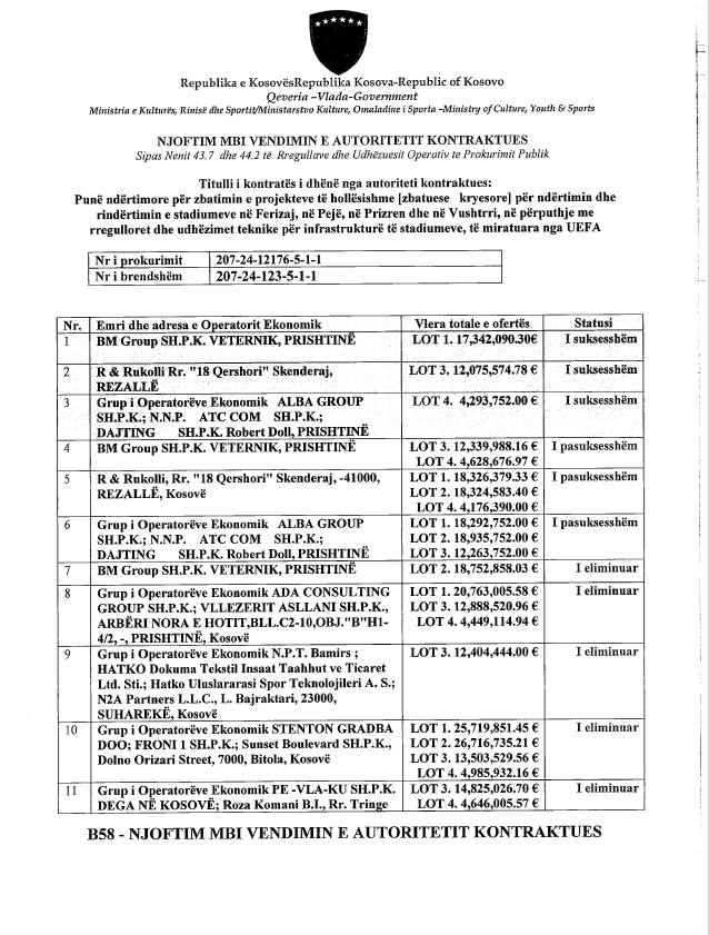 Ministria e Kulturës, Rinisë dhe Sportit ka shpallur fitues te tenderit mbi 33 milionë euro tre konsorciume për ndërtimin dhe përmirësimin e stadiumeve në Ferizaj, Pejë, Prizren dhe Vushtrri, duke shpallur fituesit për tre kontratat kryesore