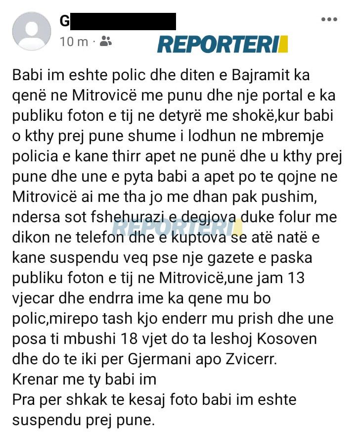 “Babi im është polic dhe ditën e Bajramit ka qene në Mitrovicë me punu dhe një portal e ka publiku foton e tij në detyre me shokë, kur Babi është kthy prej punës shumë i lodhun në mbrëmje policia e kanë thirrë apet në punë dhe u kthy prej pune dhe unë e pyta babi a apet po te qojnë në Mitrovicë, ai me tha jo ma dhanë pak pushim, ndërsa sot fshehurazi e dëgjova duke folur me dikon në telefon dhe e kuptova se atë natë e kanë suspendu veç pse një gazetë e paska publiku foton e tij në Mitrovicë”, ka shkruar në facebook të diele, djali i moshës së mitur, i njërit prej policëve të suspenduar.
