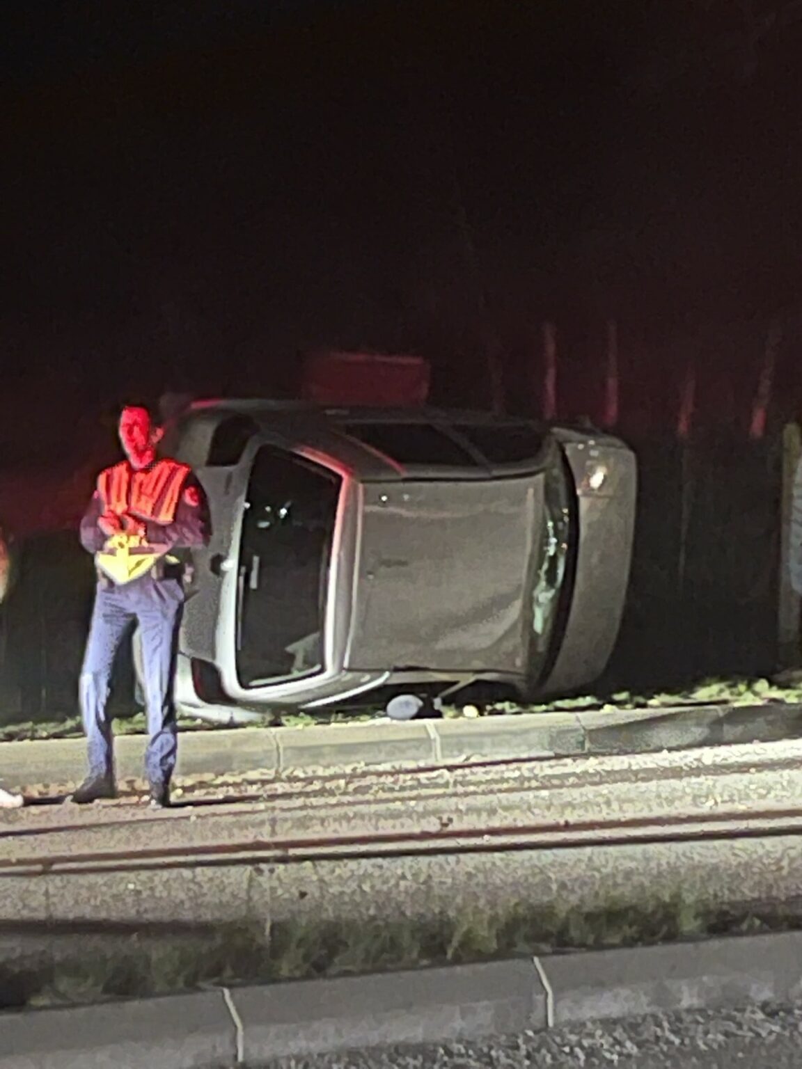 Në foto shihet një veturë e rrokullisur, përderisa në vendin e ngjarjes siç shihet në foto, kanë dalë njësitë policore.