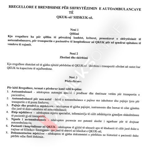 ” Kërkesa për shërbimin e transportit bëhet nga pacienti ose përcjellësi, përmes drejtorit të klinikës ku pacienti është i hospitalizuar. Dhe së bashku me historinë e pacientit dorëzohet 24 orë më herët tek drejtori i përgjithshëm, i cili bënë aprovimin brenda 24 orëve pas pranimit të kërkesës. Kërkesa për raste urgjente mund të aprovohet menjëherë nga drejtori i përgjithshëm apo i autorizuari i tij”, thuhet në rregullore.