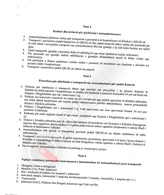 Po ashtu sipas rregullores së SHSKUK-së, Autoambulancat përdoren vetëm për pacientët e hospitalizuar në klinikat e QKUK-së dhe se transporti jashtë hapësirave të QKUK-së dhe jashtë Kosovës, bëhet vetëm për pacient, për të cilët është i nevojshëm transporti me autoambulancë dhe kur gjendja e tij nuk lejon bartjen me mjete tjera dhe se gjatë transportit gjendja e pacientit duhet të mbikëqyret nga ekipi mjekësor.