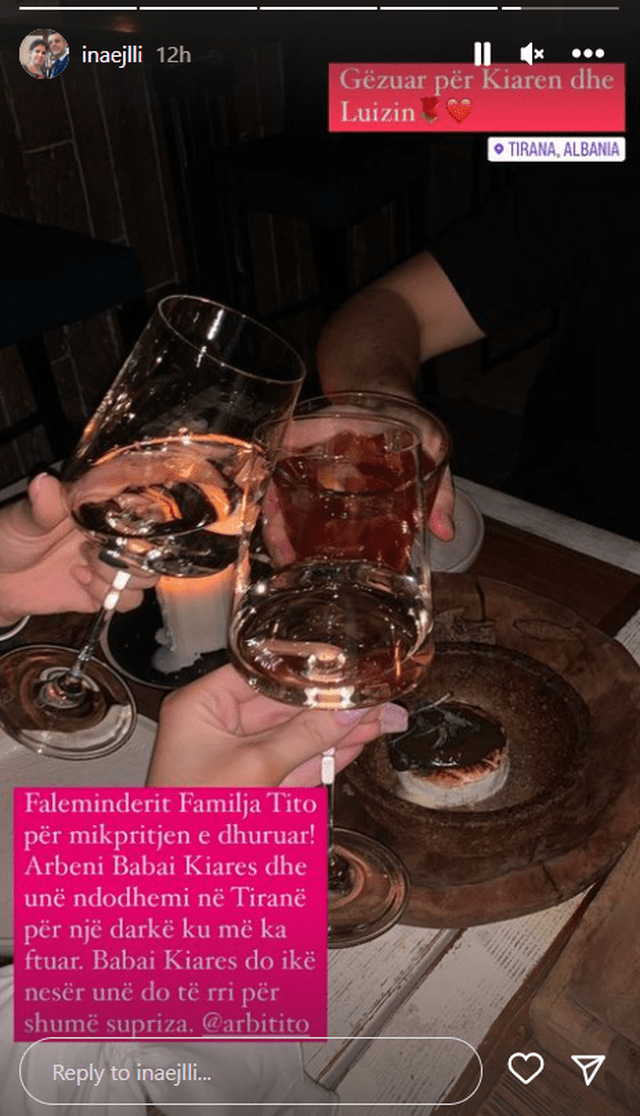 “Gëzuar për Kiarën dhe Luizin. Faleminderit familja Tito për mirëkuptimin e dhuruar! Arbeni, babai i Kiarës dhe unë ndodhemi në Tiranë, për një darkë ku më ka ftuar. Babai i Kiarës do iëk nesër, unë do të rri për shumë surpriza”, shkruan Ina Ejlli.