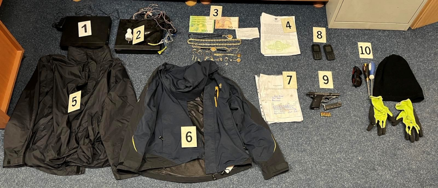 “Me vendim të gjykatës është kryer kontroll në objektet e banimit të të dyshuarit me çrast janë gjetur dhe sekuestruar: një pistoletë me një karikator, gjashtë copë fishekë, disa stoli ari, rrobe, telefona dhe disa gjëra tjera të cilat dyshohet se janë përdorur me rastin e kryerjes së vjedhjes”, thuhet më tej në njoftim të Policisë.
