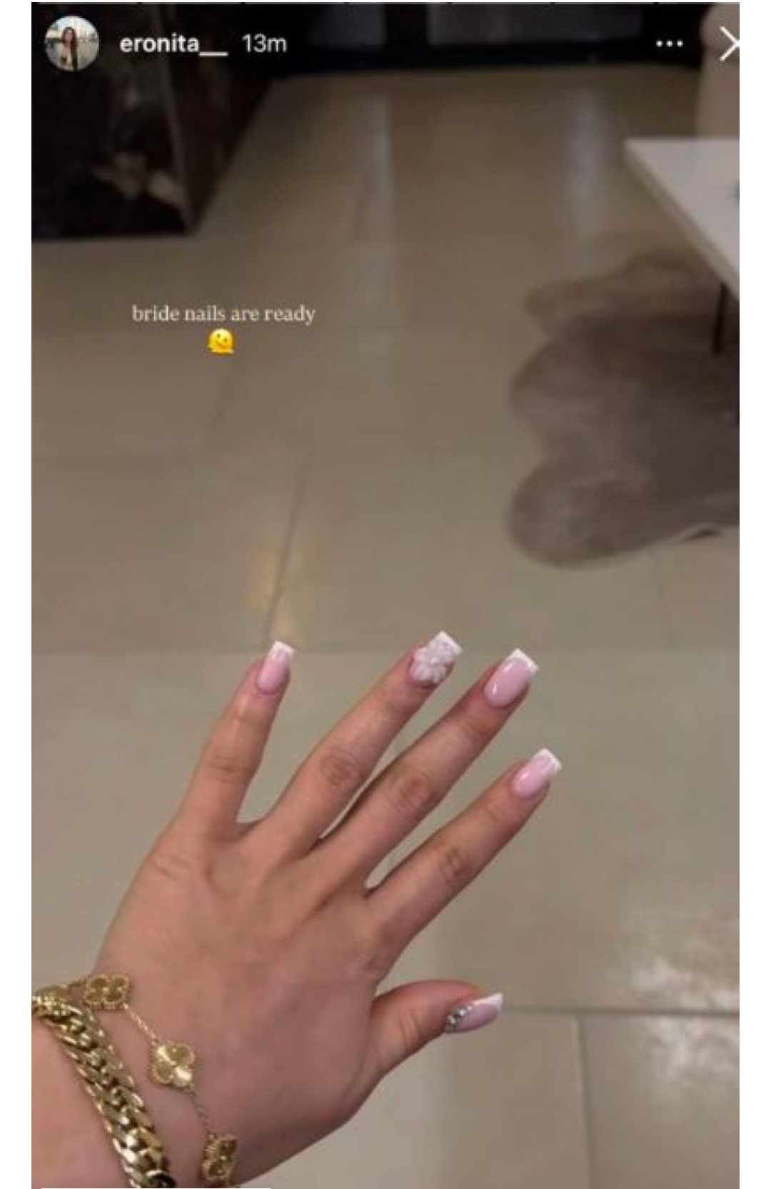 Dyshimet janë forcuar edhe më tej nga një postim i fundit i Eronitës në Instagram, ku ajo shfaq thonjtë e rinj, të kuruar me detaje elegante, shoqëruar me mbishkrimin domethënës: “Thonjtë e nuses janë gati”. Ky mesazh ka ndezur menjëherë aludimet për një martesë të afërt, por edhe si një sinjal i qartë për shtatzëninë.