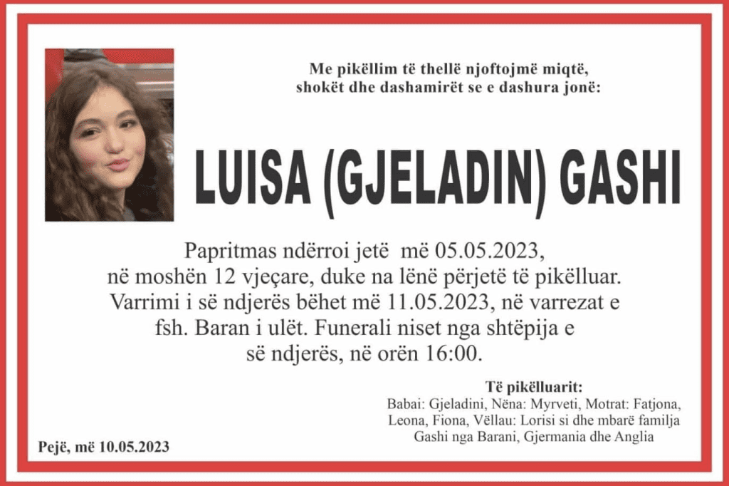 Një ngjarje e dhimbshme ka ndodhur të premten në familjen Gashi nga fshati Baran i Ulët i Pejës. Vajza e tyre, Luisa, është ndarë nga jeta papritmas në moshën 12-vjeçare.