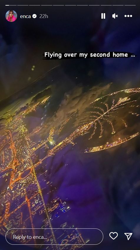Ndërsa ndodhej ende mbi Dubain e ndriçuar, Enca shkroi në mbishkrimin e fotografisë: “Duke fluturuar sipër shtëpisë time të dytë”.
