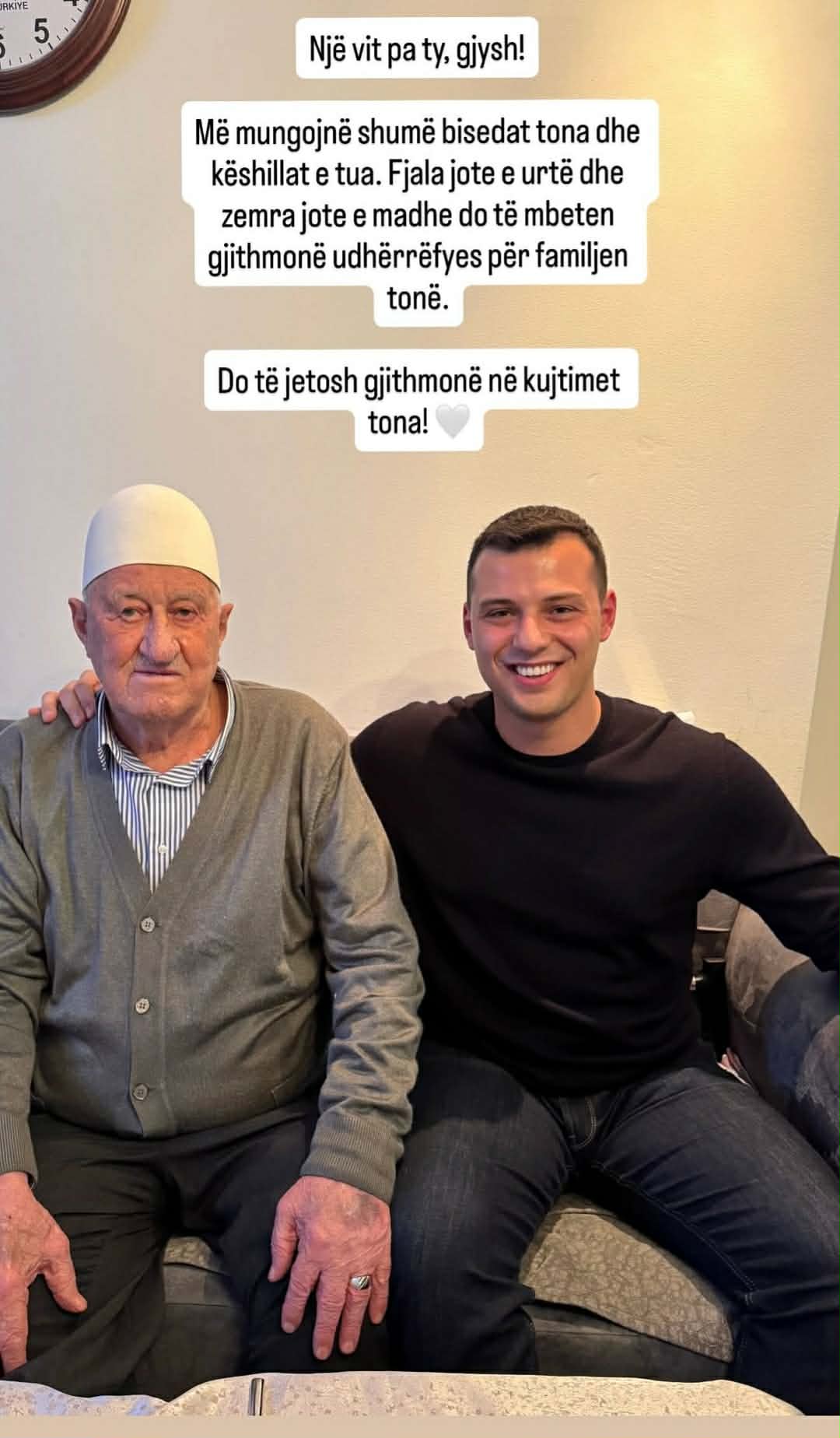 “Një vit pa ty, gjysh! Më mungojnë shumë bisedat tona dhe këshillat e tua. Fjala jote e urtë dhe zemra jote e madhe do të mbeten gjithmonë udhërrëfyes për familjen tonë. Do të jetosh gjithmonë në kujtimet tona!”, ka shkruar ai.
