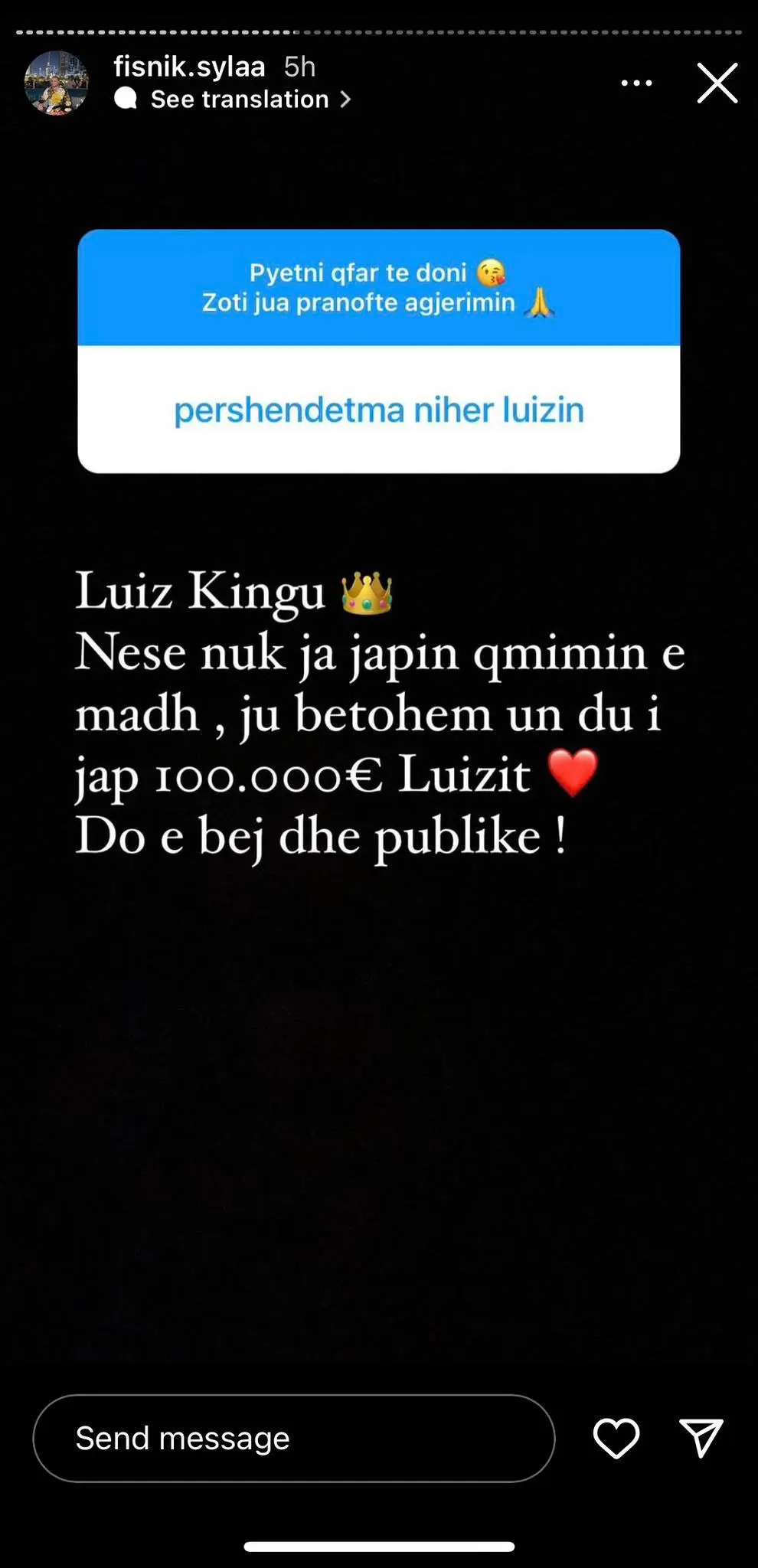 “Nëse nuk ja japin çmimin e madh, ju betohem unë do i jap 100 mijë euro Luizit. Do e bëj publike”, ka shkruar Syla në Instagram.