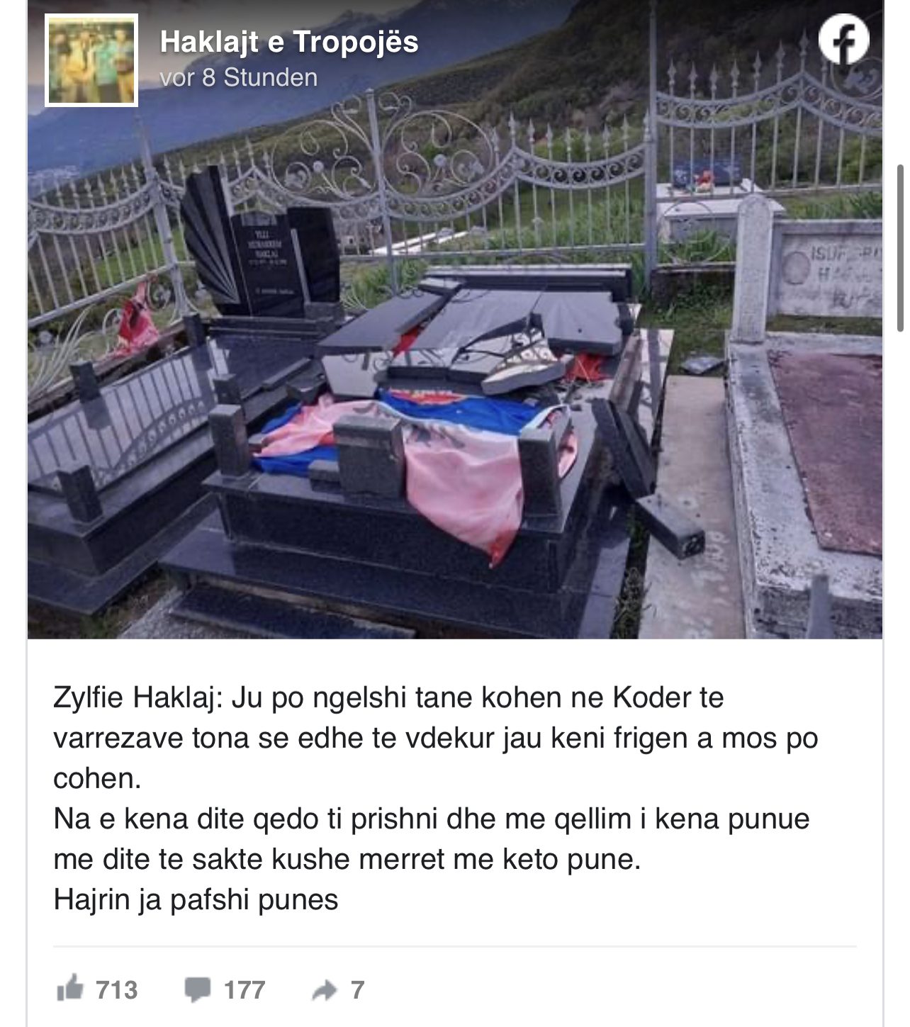 “Ju po ngelshi tanë kohën në Kodër të varrezave tona se edhe të vdekur jau keni frigën a mos po cohen. Na e kena ditë qedo ti prishni dhe me qellim i kena punue me ditë të saktë kush merret me këto punë. Hajrin ja pafshi punës”, shkruan ajo.