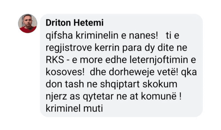 “Si politikan dhe qytetar i këtij vendi është e vërtetë që ditë më parë kam regjistruar një veturë në Komisariatin e Policisë Leposaviç. Si të gjithë. Aty pashë Driton Hetemin, i cili është vëllai i kryetarit aktual Lulzim Hetemi.