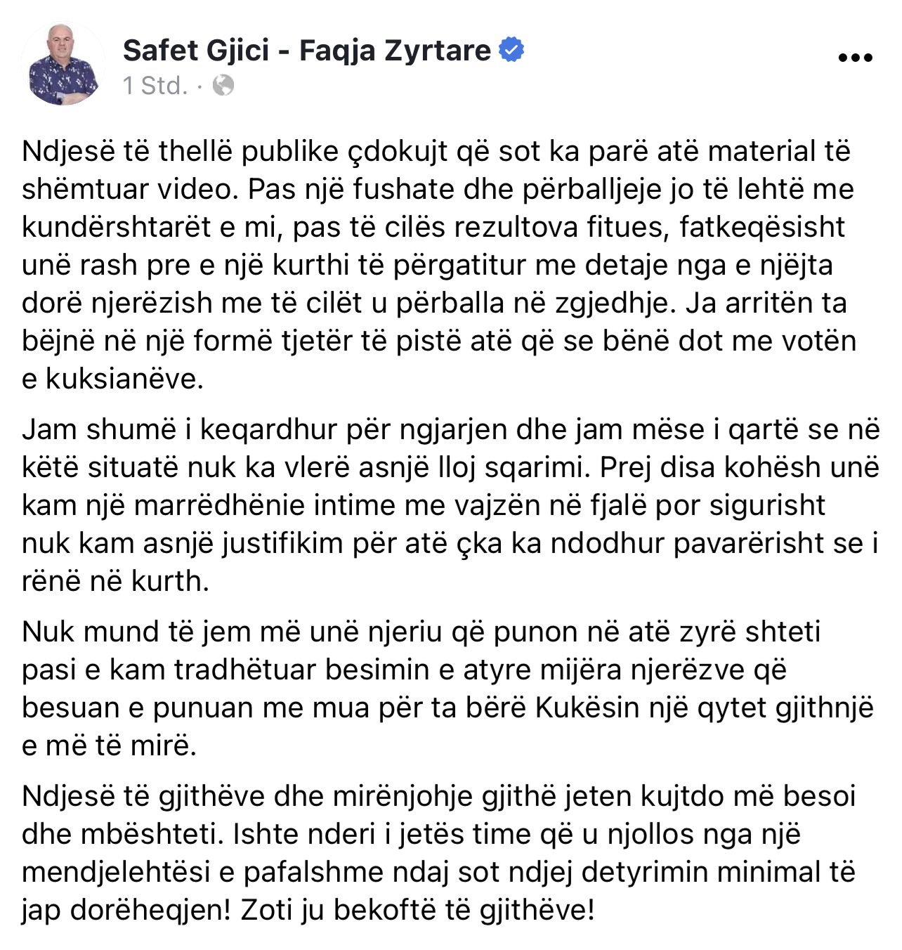 “Ndjesë të thellë publike çdokujt që sot ka parë atë material të shëmtuar video. Pas një fushate dhe përballjeje jo të lehtë me kundërshtarët e mi, pas të cilës rezultova fitues, fatkeqësisht unë rash pre e një kurthi të përgatitur me detaje nga e njëjta dorë njerëzish me të cilët u përballa në zgjedhje. Ja arritën ta bëjnë në një formë tjetër të pistë atë që se bënë dot me votën e kuksianëve”, ka shkruar ai.