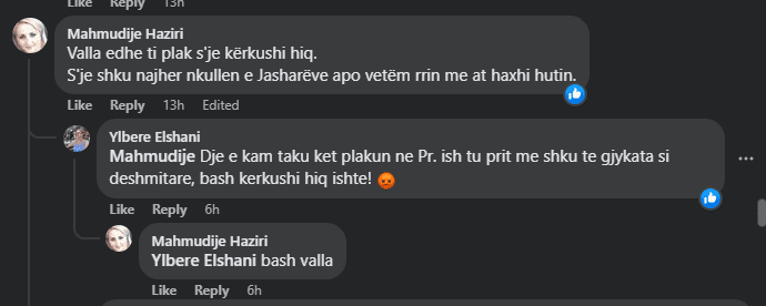 Një grua me emrin Mahmudije Haziri e ka quajtur qen plak Milazim Thaçin. Ajo është përfshirë në disa replika me komentues, ku e ka ofenduar.