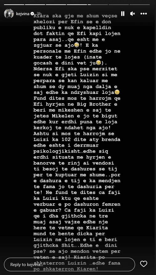 Ani pse ka kohë prej kur është larguar nga “Big Brother VIP Albania”, Kejvina vazhdon të komentojë situatat në shtëpi.