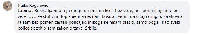 “Labinot, edhe mund të flasë palidhje sikurse ti. Mos përmend emra palidhje. Nuk të njohë se kush je, por po shoh që po komentojnë të tjerë nga Rahoveci. Unë kam qenë polic i ndershëm dhe nuk kam frikësuar askë. Si çdo polic, kam zbatuar urdhrat e shtetit”, shkroi ndër tjerash Roganovic.