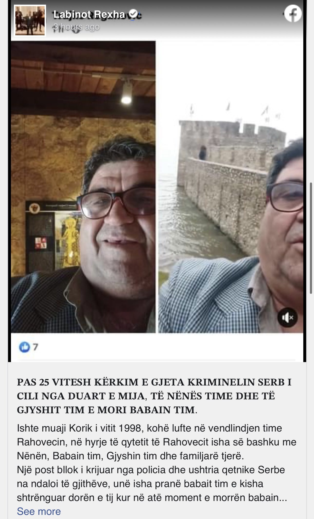“Ky njeri me emrin 𝐓𝐑𝐀𝐉𝐊𝐎 𝐑𝐎𝐆𝐀𝐍𝐎𝐕𝐈𝐂 i cili edhe operonte në Rahovec si polic së bashku me 𝐌𝐀𝐑𝐊𝐎 𝐅𝐈𝐋𝐈𝐏𝐎𝐕𝐈𝐂 (𝐌𝐔𝐒𝐓𝐀𝐐𝐈) në atë kohë ishin iniciatorët e gjithë asaj skene të tmerrshme të cilën e pash me sy të një fëmiu adoleshent. Babain tim e burgosën dhe më pas e keqtrajtuan, e rrahën dhe e torturuan në mënyrën më mizore, ku pas luftës për shkak të gjithë kësaj babai im u sëmurë dhe nuk mundi ti mbijetojë sëmundjes e cila ju krijoji nga kjo ngjarje dhe vdiq.”, shkroi ai.