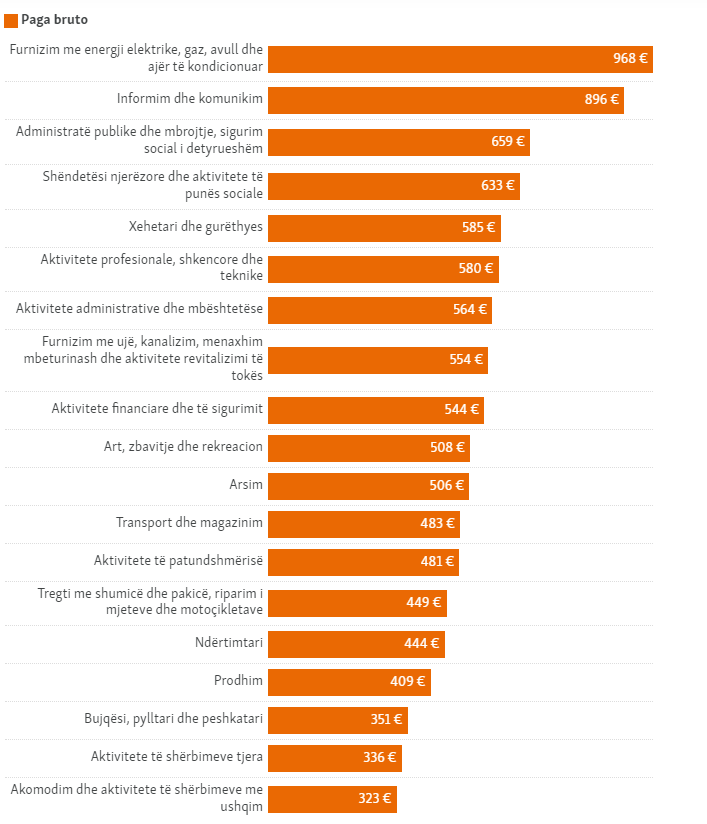 Sipas aktiviteteve ekonomike, pagat më të larta në Kosovë janë në sektorin e energjisë – ku arrijnë në afro 970 euro – pasuar nga sektori i informimit dhe komunikimit, ku janë afro 900 euro.
