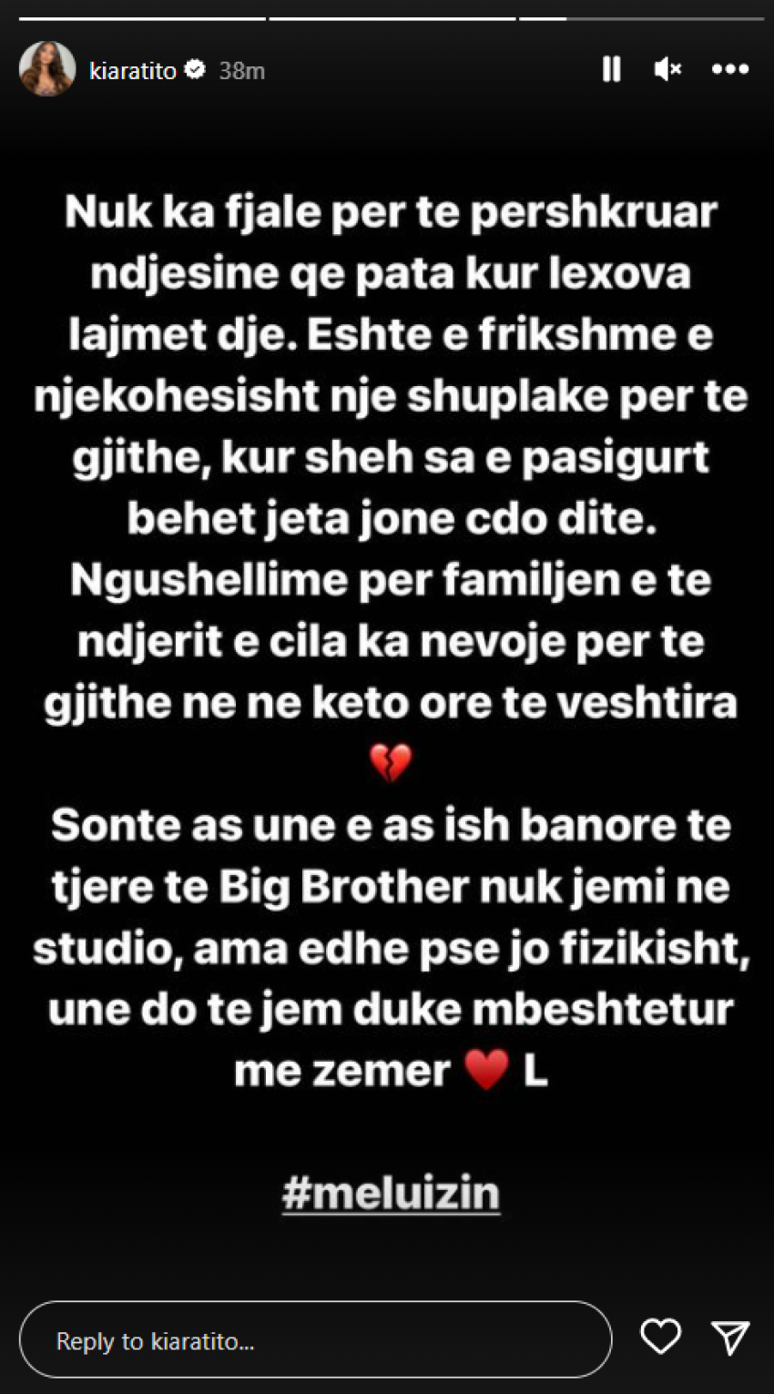 “Nuk ka fjalë për të përshkruar ndjesinë që pata kur lexova lajmet dje. Është e frikshme e njëkohësisht një shuplakë për të gjithë, kur sheh sa e pasigurt bëhet jeta jonë çdo ditë. Ngushëllime për familjen e të ndjerit e cila ka nevojë për të gjithë në këto orë të vështira. Sonte as unë e as ish-banorët të tjerë të Big Brother nuk jemi në studio, ama edhe pse jo fizikisht, unë do të jem duke e mbështetur me zemër Luizin, me Luizin”, ka shkruar Kiara.
