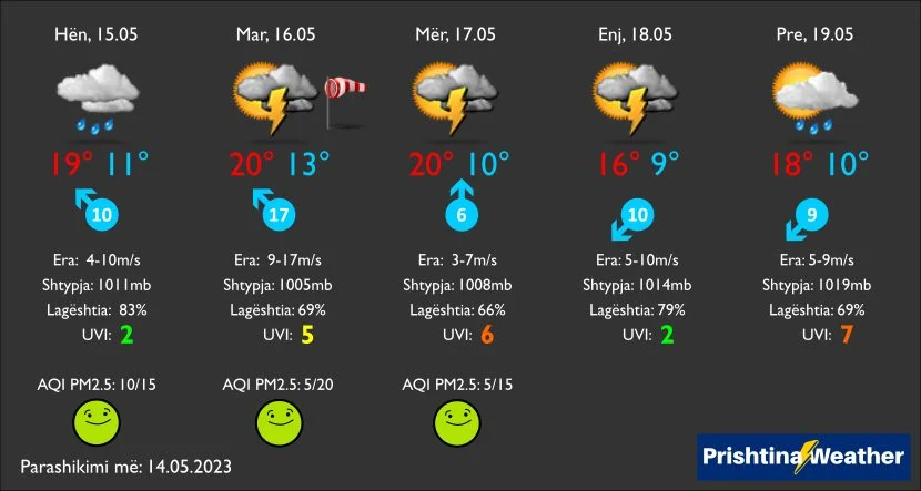 14.05.2023 – Mot i paqëndrueshëm dhe i ndryshueshëm parashihet edhe përgjatë javës së tretë të muajit maj.  Do të ketë më shumë vransira, por edhe periudha me diell, si dhe të reshura shiu kohëpaskohe, që orëve të pasdites mund të shfaqen edhe në formë rrebeshesh shiu me bubullima.  Më pak gjasa për shi, për momentin, paraqiten ditën e premtë dhe në fundjavë.  Temperaturat do të jenë lehtazi nën vlera mesatare, me maksimale ndërmjet 16C e 20C, e ato minimale ndërmjet 9C e 13C.