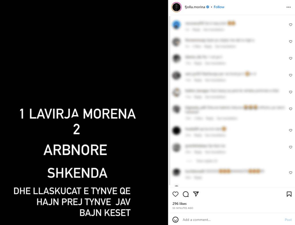 Me këtë, ajo la të kuptohet se ajo ka probleme dhe po akuzon Morena tarakun, Arbnora Ademajn dhe Shkenda Dubovën.