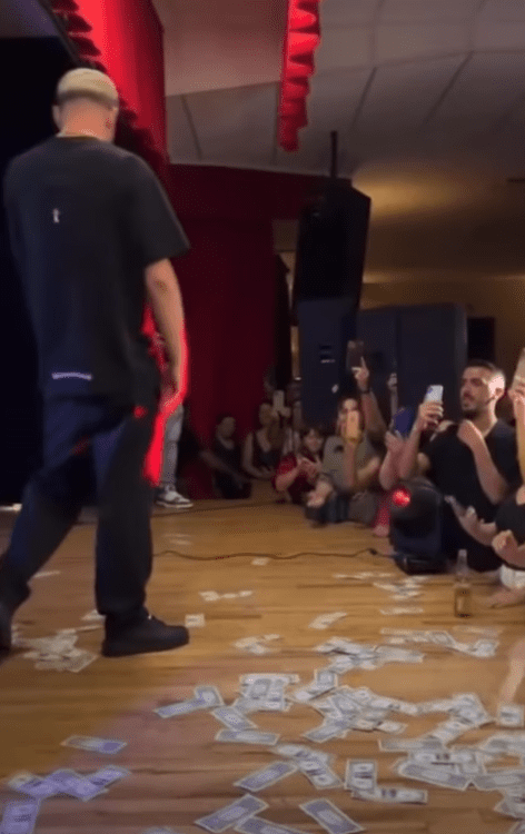 Ndërsa po performonte, në disa prej videove shihet se është mbushur me dollarë.