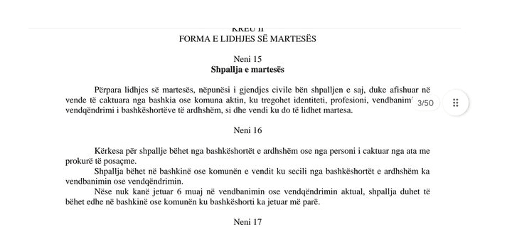 “Përpara lidhjes së martesës nënpunësi i gjendjes civile bën shpalljen e saj duke e afishuar në vende të caktuara nga bashkia aktin, ku tregohet identiteti, profesioni, vendbanimi dhe vendqendrimi i bashkëshorteve të ardhshem si dhe vendi ku do të lidhet martesa”, thuhet në një nga pikat e ligjit.