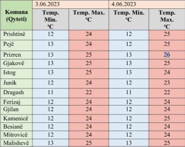 Instituti Hidrometeorologjik i Kosovës bën të ditur se në pjesën e parë të ditës do të mbajë mot kryesisht me diell, por që vranësirat konvektive do të fillojnë nga gjysma e ditës, ku më pas në orët e pasdites do të jenë në zhvillim për të krijuar kushte për reshje shiu.