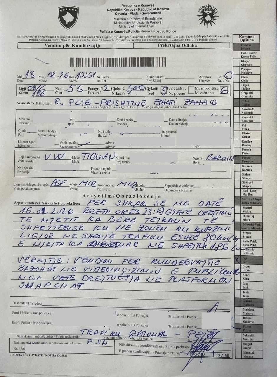 “Me datёn 15.01.2026, kundёrvajtёsi gjatё drejtimit tё mjetit ka bёrё tejkalimin e shpejtёsisё nё zonën e kufizimit ligjor me shenjё trafiku 80 km/h, kundёrvajtёsi ka drejtuar veturën me shpejtёsi 186 km/h, ky veprim ёshtё incizuar nga vetё kundёrvajtёsi, ku me datёn 18.02.2026 kundёrvajtёsit i ёshtё shqiptuar fletgjoba prej: 500 euro, 5 pikё negative dhe 6 muaj masё mbrojtёse”.