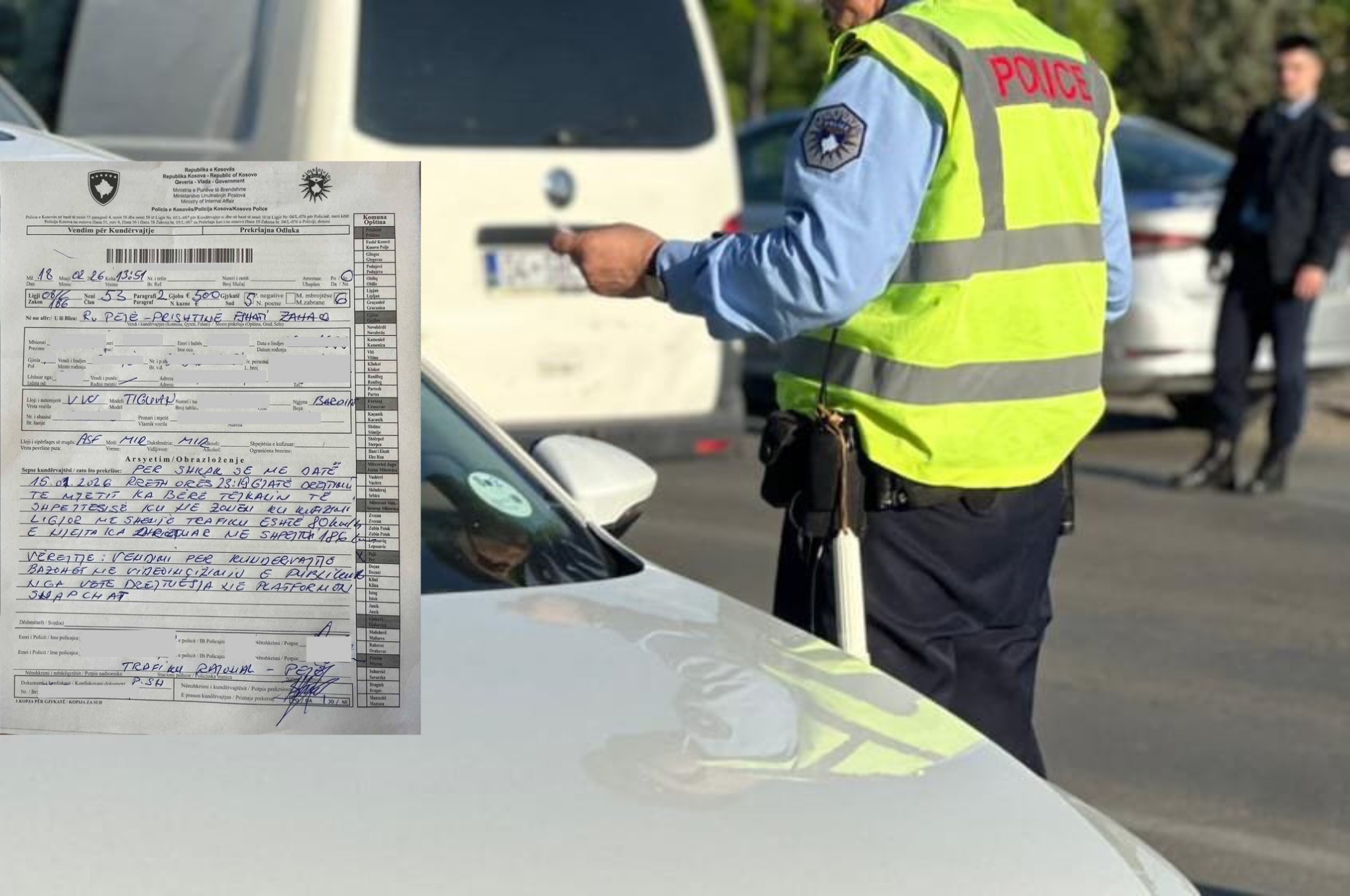 “Me datёn 15.01.2026, kundёrvajtёsi gjatё drejtimit tё mjetit ka bёrё tejkalimin e shpejtёsisё nё zonën e kufizimit ligjor me shenjё trafiku 80 km/h, kundёrvajtёsi ka drejtuar veturën me shpejtёsi 186 km/h, ky veprim ёshtё incizuar nga vetё kundёrvajtёsi, ku me datёn 18.02.2026 kundёrvajtёsit i ёshtё shqiptuar fletgjoba prej: 500 euro, 5 pikё negative dhe 6 muaj masё mbrojtёse”.