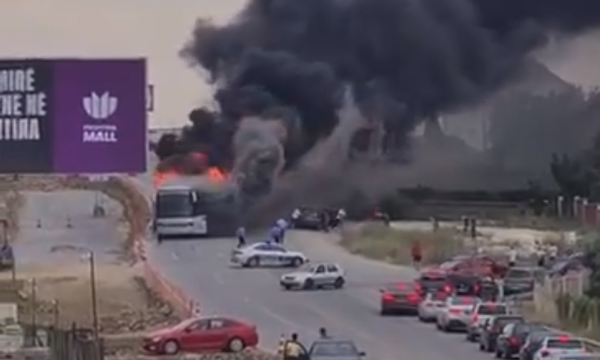Në pamjet e publikuara shihet se autobusi është djegur plotësisht.