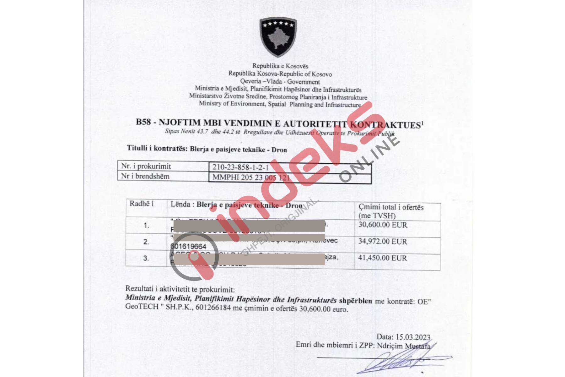 Ndryshe sipas njoftimit, MPHI-ja e ka shpërblen me kontratë kompaninë e cila ka ofruar ccmimin më të lirë 30,600.00 euro, ndërsa çmimi më i lartë ka qenë 41,450.00 euro.