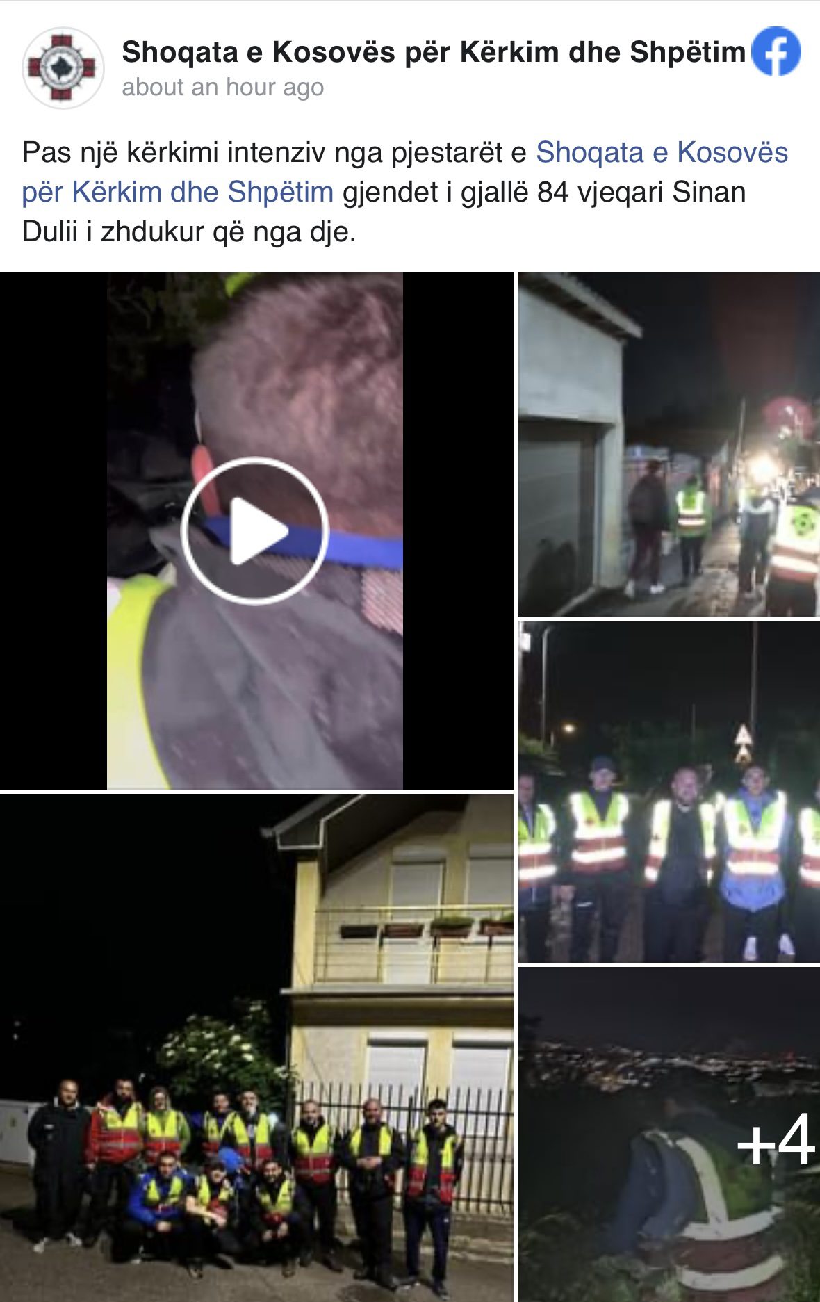 “Pas një kërkimi intenziv nga pjestarët e Shoqata e Kosovës për Kërkim dhe Shpëtim gjendet i gjallë 84 vjeqari Sinan Dulii i zhdukur që nga dje”, thonë ata.