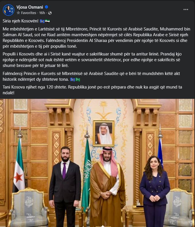 “Në takimin e sotëm ndërmjet presidentes së Kosovës, znj. Vjosa Osmani, Princit të Kurorës së Arabisë Saudite, Muhamed bin Selman al Saud, presidentit të Sirisë, Ahmed al Sharaa dhe Myftiut Naim ef. Tërnava, kryetari i Sirisë deklaroi se Siria njeh pavarësinë e Kosovës, dhe shprehu gatishmërinë për një bashkëpunim ndërmjet dy vendeve”, është thënë në njoftimin e BIK-ut.
