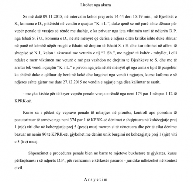 Sipas aktakuzës, Pajazitaj akuzohej se më parë e deri më 9 nëntor 2015, në fshatin Strellc, Komuna e Deçanit, pa autorizim ka poseduar armën dhe atë një revole të tipit të panjohur dhe një pushkë gjuetie me numër serik 0193117 si dhe 12 fishekë të kësaj pushke, në atë mënyrë që më revole ditën kritike ka kryer veprën penale të cekur si më lartë.