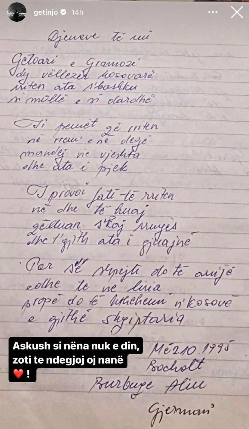 Reperi i mirënjohur, Getoar Aliu i njohur si Getinjo, ka postuar dy poezi të shkruara nga nëna e tij, Burbuqe Aliu.