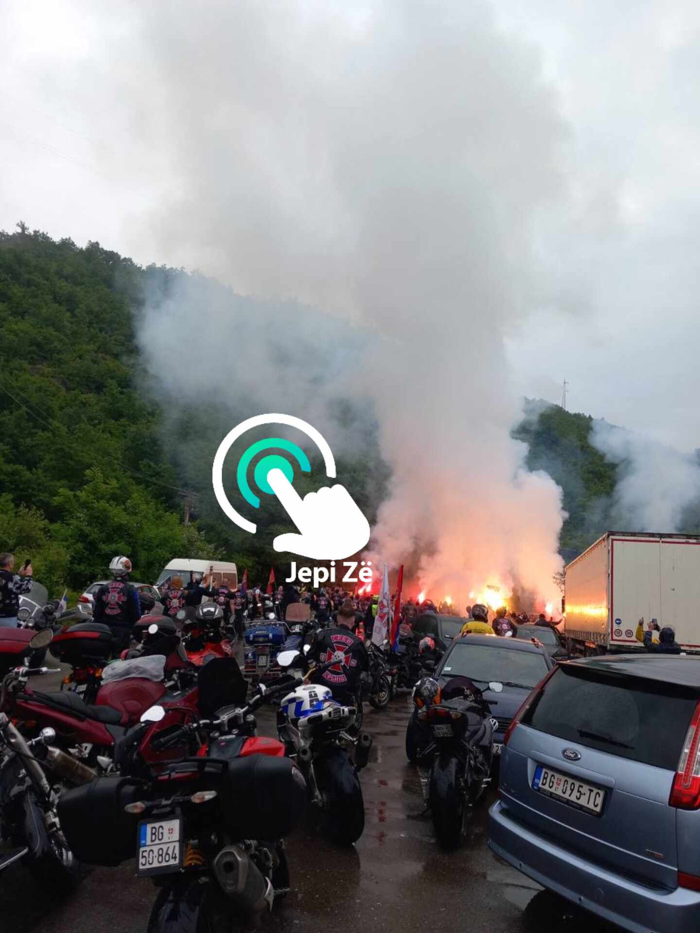 Serbet e grumbulluar, janë kryesisht motoristë të cilët kanë bllokuar rrugën, afër pikës kufitare ne Jarinje ku edhe kanë ndezur fushekzjarre.