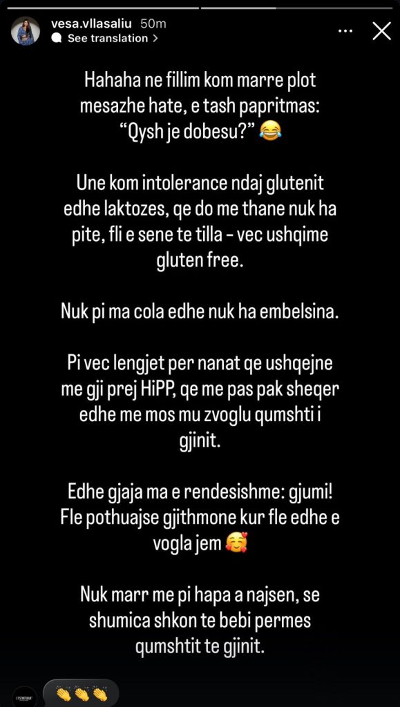 Përmes disa postimeve në Instastory, ajo ka treguar rrugëtimin e saj të rënies në peshë. Duke ndarë një foto në pasqyrë ku duket mjaft në formë, Vesa zbuloi se kishte arritur deri në 115 kilogramë, ndërsa tani ka zbritur në 90 kilogramë, duke lënë të kuptohet se synon të humbasë edhe më shumë peshë.