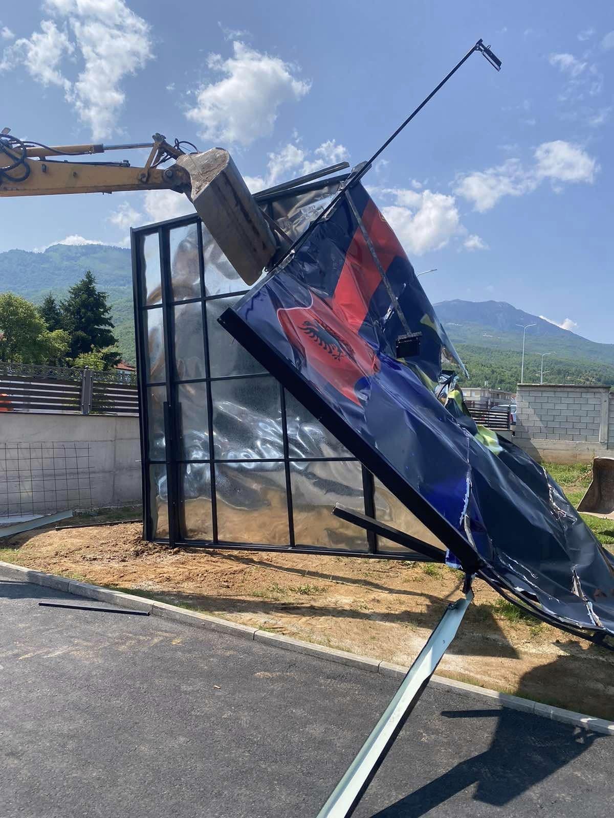 “Pa asnjë arsyetim e me masa të rrepta të Policisë së Kosovës,dhe Kforit Italian dhe pa asnjë dokument apo vendim për rrënim, pasditën e sotme më janë rrënuar panot të cilat ishin pronë e imja. Qudija e gjithë kësaj pune është se pse u desht të rrënohen bash sot, kur në të i vëndosa këto tri shkronja UÇK sepse panot ishin aty tash e disa muaj.”, ka shkruar Hulaj.