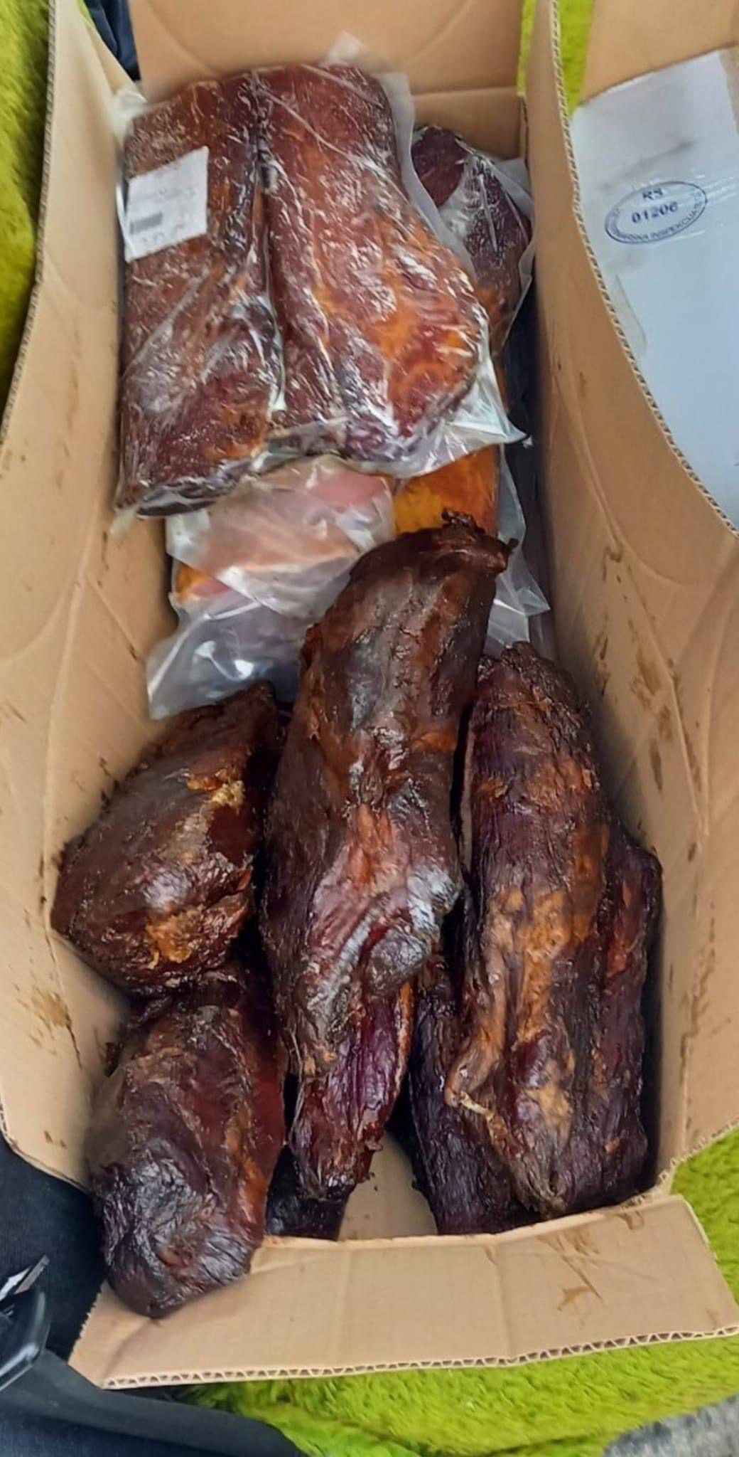 Gjatë kontrollimit të automjetit, në bagazh nën ulëset e pasme dhe nën ulësen e pasagjerit janë gjetur katër (4) paketa me mish derri dhe deleje.