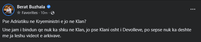 “Pse Adriatiku ne Kryeministri e jo ne Klan? Une jam i bindun qe nuk ka shku ne Klan, jo pse Klani osht i Devolleve, po sepse nuk ka deshte me ja leshu videot e arkivave”, ka shkruar Buzhala në Facebook.