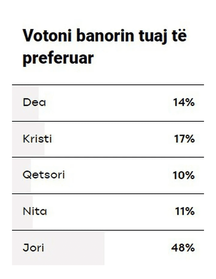 Jori ka marrë 48% të votave, pas saj vjen Kristi me 17%, Dea me 14%, Nita me 11% dhe Qetsori me 10%.