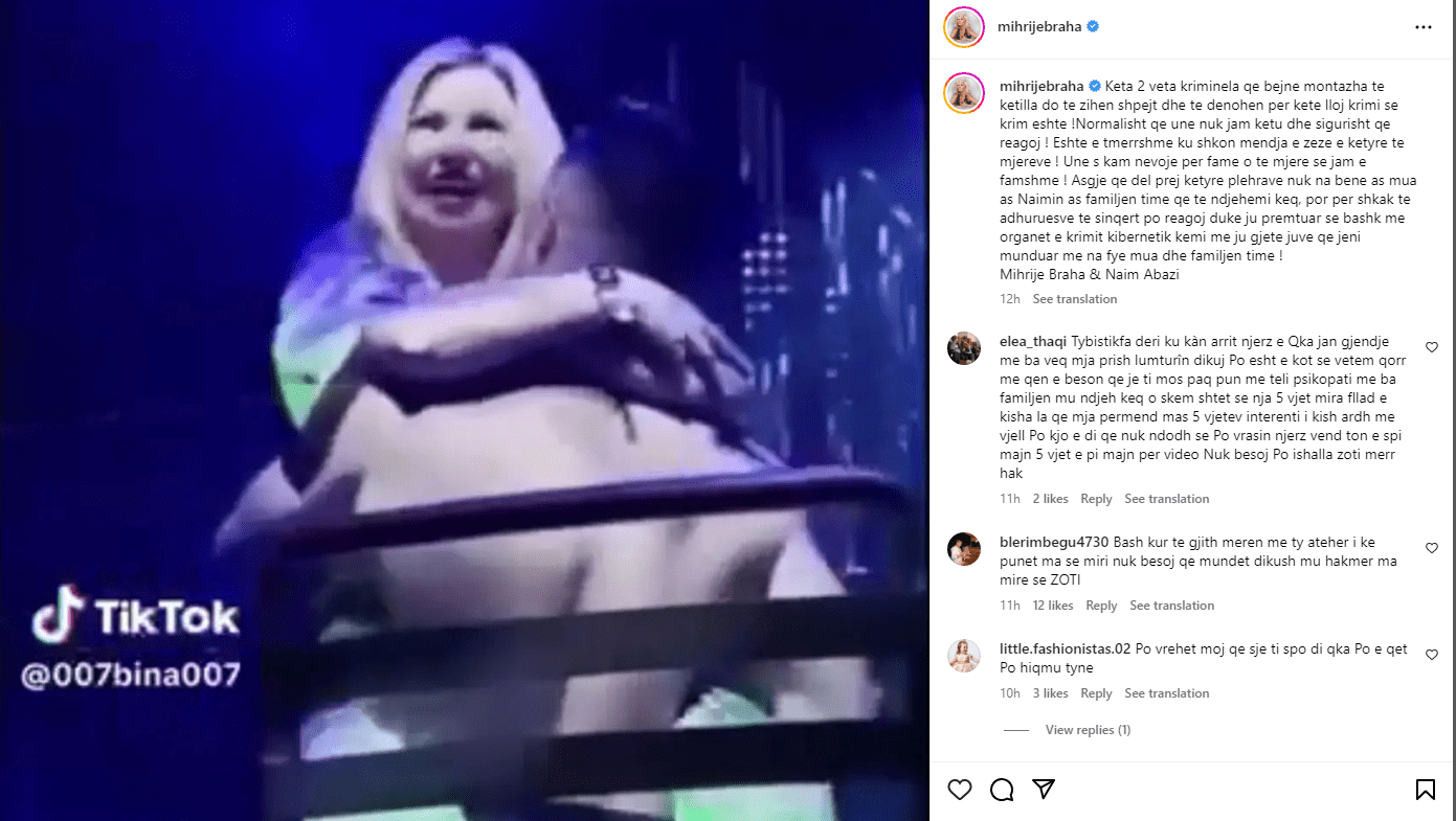 “Keta 2 veta kriminela qe bejne montazha te ketilla do te zihen shpejt dhe te denohen per kete lloj krimi se krim eshte !Normalisht qe une nuk jam ketu dhe sigurisht qe reagoj ! Eshte e tmerrshme ku shkon mendja e zeze e ketyre te mjereve ! Une s kam nevoje per fame o te mjere se jam e famshme ! Asgje qe del prej ketyre plehrave nuk na bene as mua as Naimin as familjen time qe te ndjehemi keq, por per shkak te adhuruesve te sinqert po reagoj duke ju premtuar se bashk me organet e krimit kibernetik kemi me ju gjete juve qe jeni munduar me na fye mua dhe familjen time !