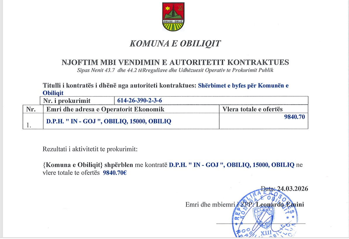 Bëhet fjalë për kontratën me numër 614-26-390-2-3-6/C593, e cila ka të bëjë me “Shërbimet e byfes për Komunën e Obiliqit”. Kontrata është dhënë më 31 mars 2026, ndërsa nënshkrimi i saj është planifikuar për 1 prill 2026.