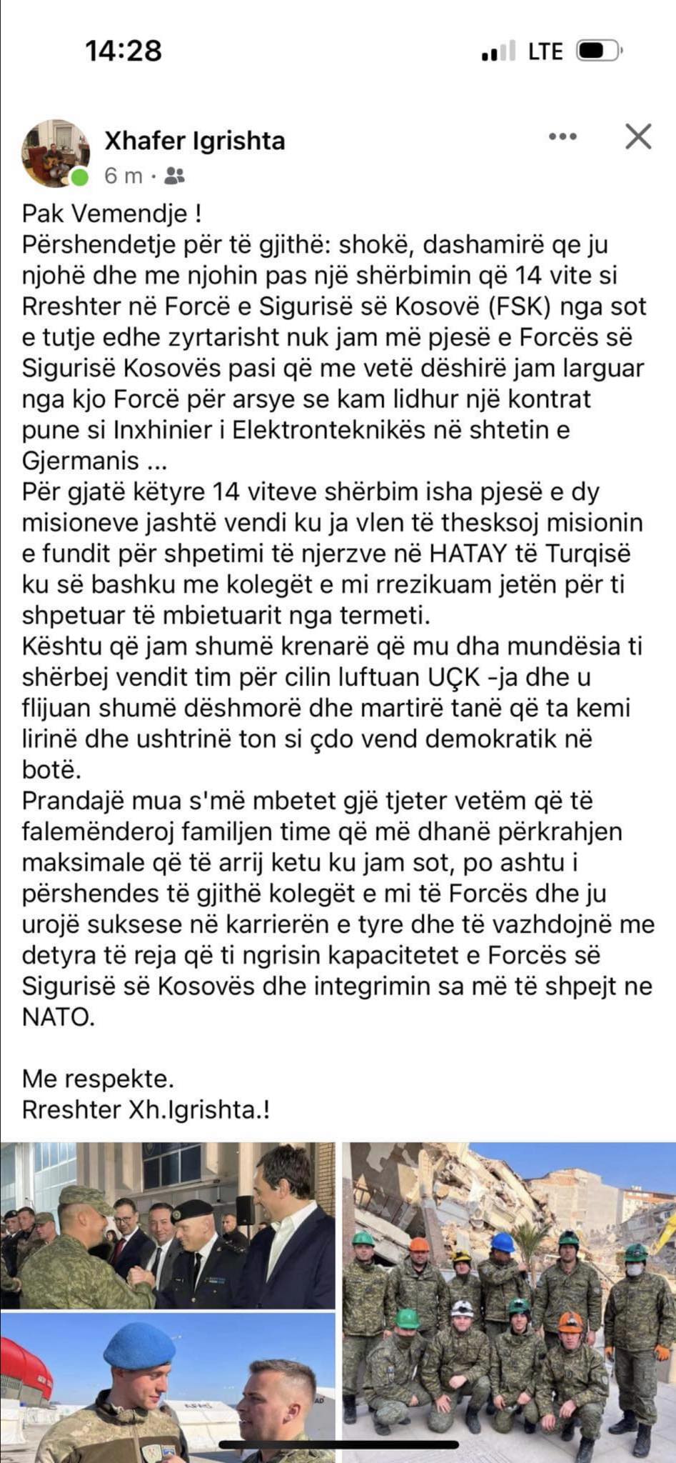 “Pas një shërbimi prej 14 vitesh si rreshter në FSK nga sot e tutje edhe zyrtarisht nuk jam pjesë e Forcës së Sigurisë së Kosovës pasi që me vetë dëshirë për arsye se kam lidhur një kontratë punë në Gjermani”, ka shkruar ai.