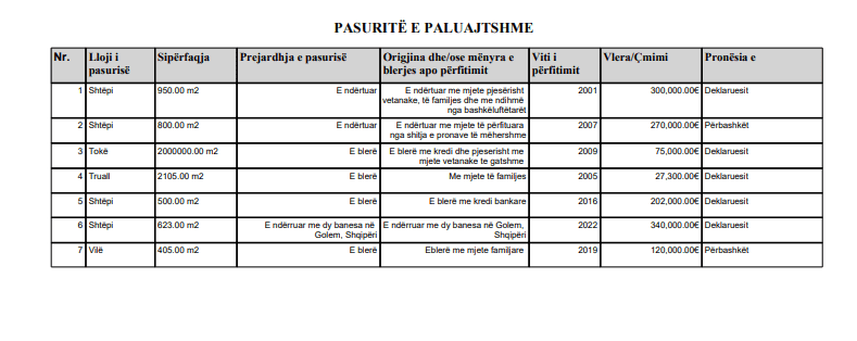 Sipas dokumentit të publikuar nga AKK-ja, i pari i AAK-së ka tri shtëpi në emër të tij, një tokë, një truall, një shtëpi tjetër dhe një vilë të përbashkët.