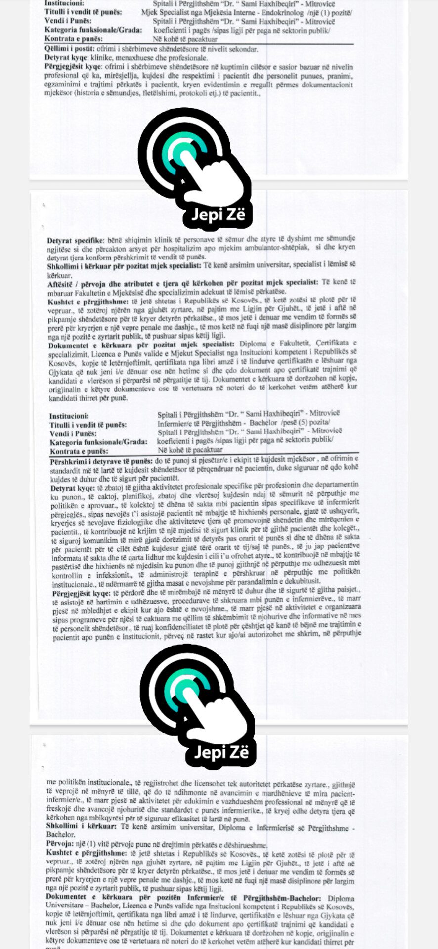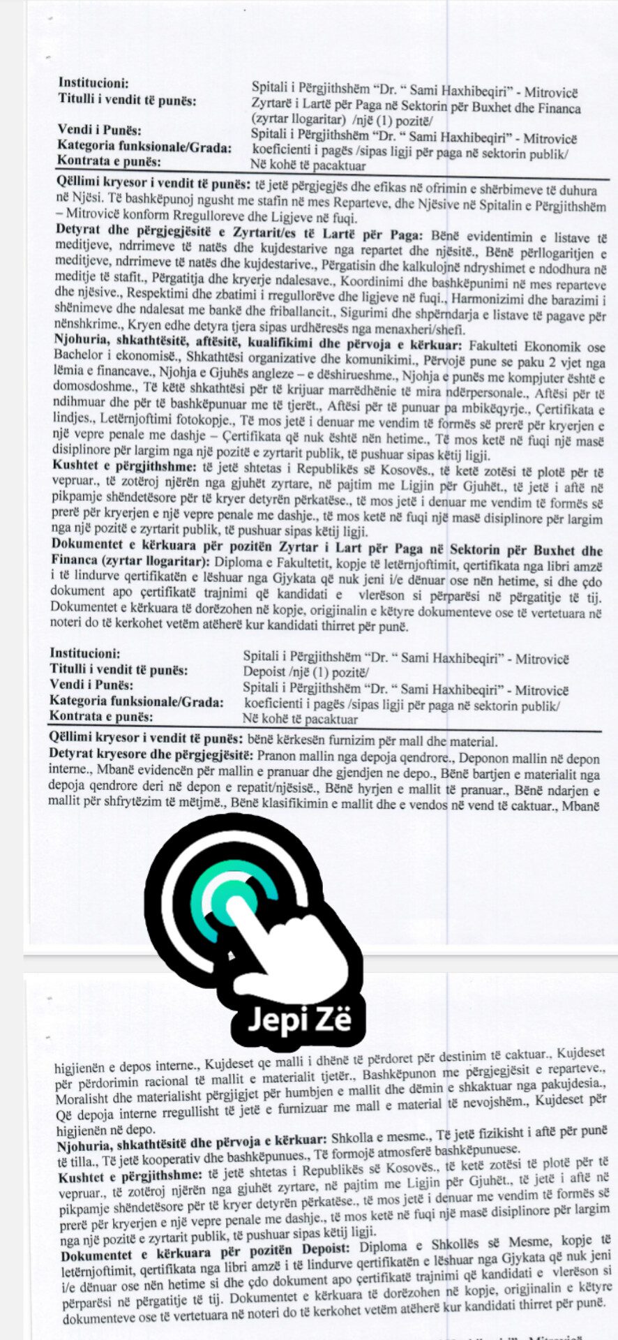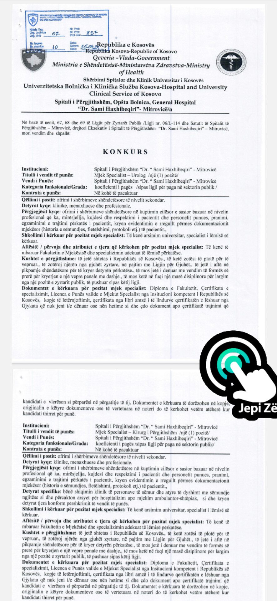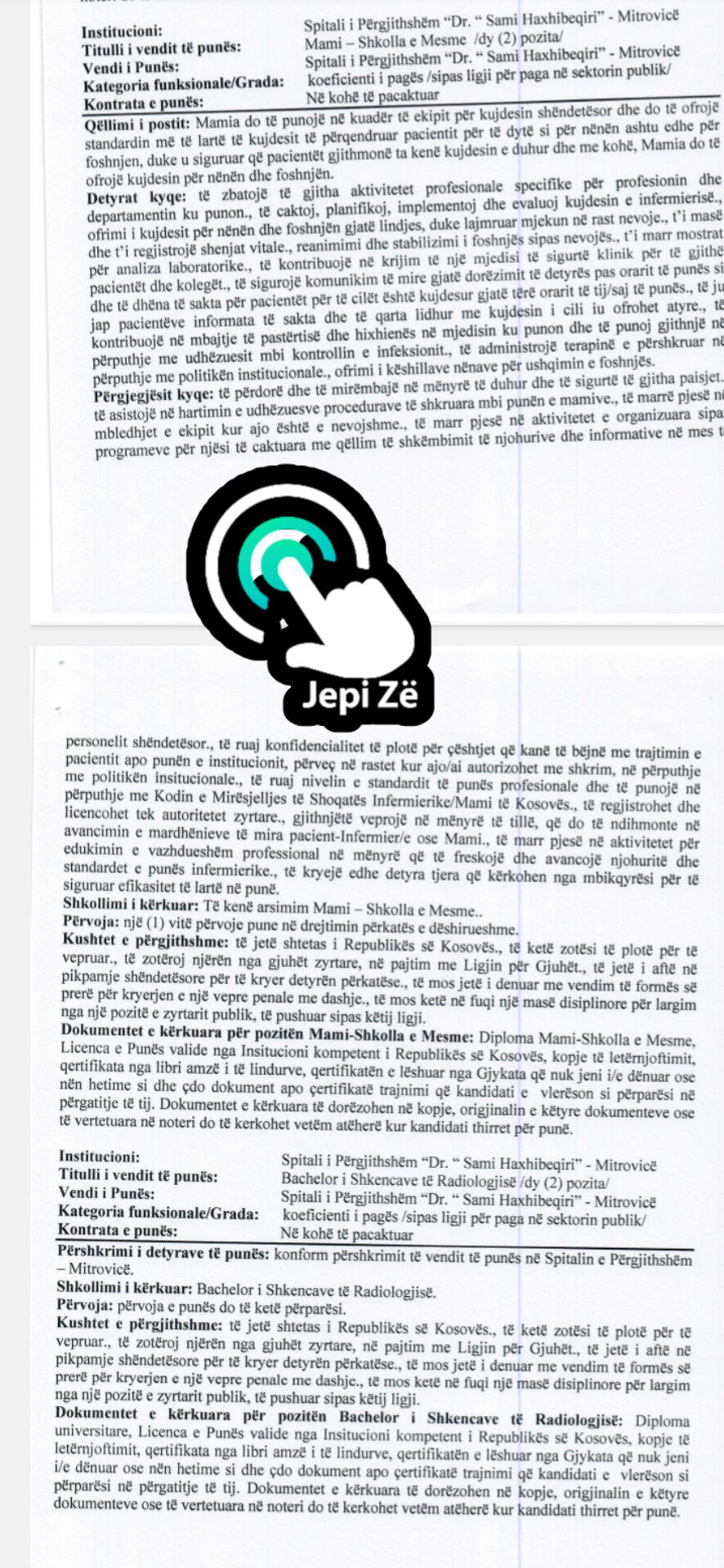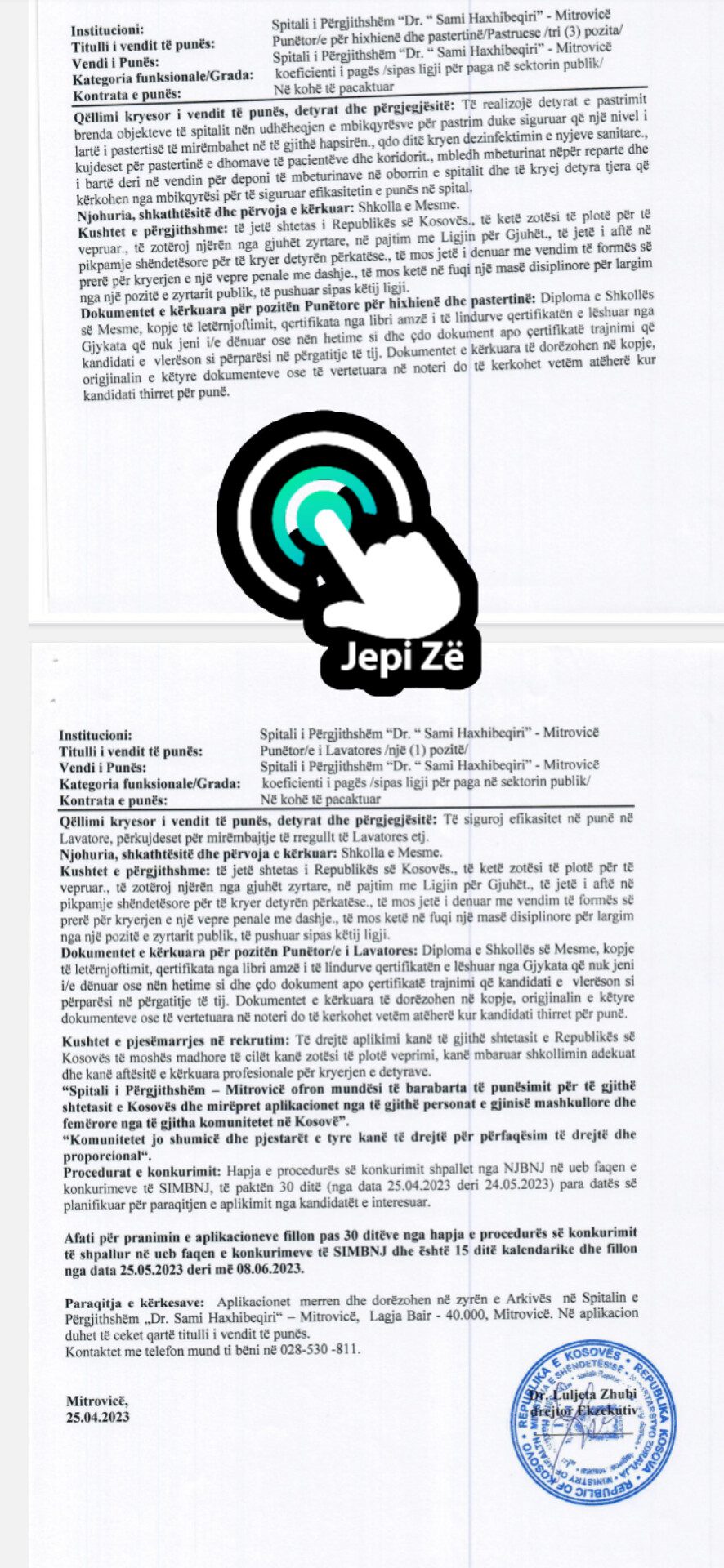 Sipas njoftimit të bërë nga Shërbimi Spitalitor dhe Klinik Universitar i Kosovës përfshijnë pozita të ndryshme brenda spitalit “ Sami Haxhibeqiri”, shkruan Gazeta Shneta.