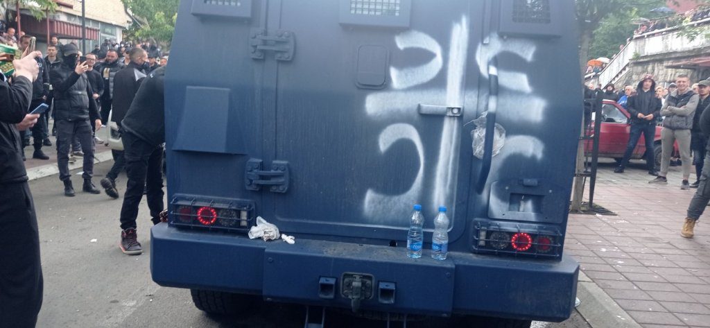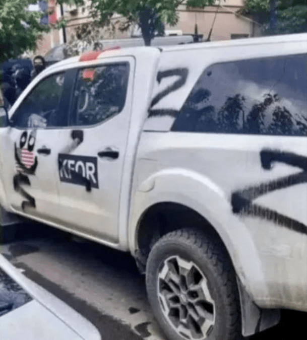 Protestuesit serbë në komunën e Zveçanit kanë vazhduar me provokime, duke vizatuar simbole nacionaliste serbe edhe në autoblindën e Policisë së Kosovës dhe në veturën e KFOR-it.