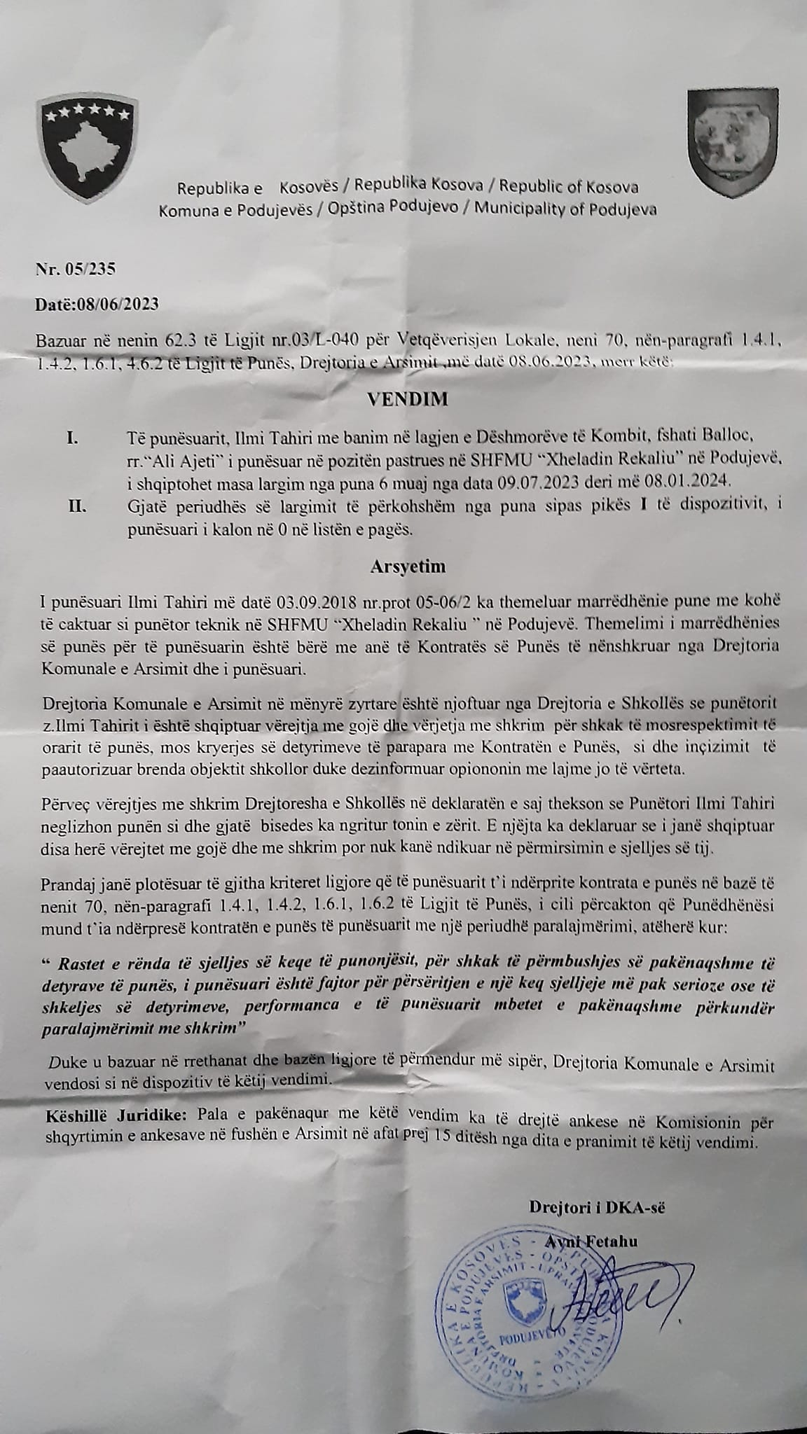 Është suspenduar për gjashtë muaj Ilmi Tahiri, punëtori teknik i shkollës “Xheladin Rekaliu” në Podujevë. Suspendimi i tij erdhi pasi ai dha një intervistë për Gazetën Insajderi duke treguar hallet e shkollës ku ai punonte.