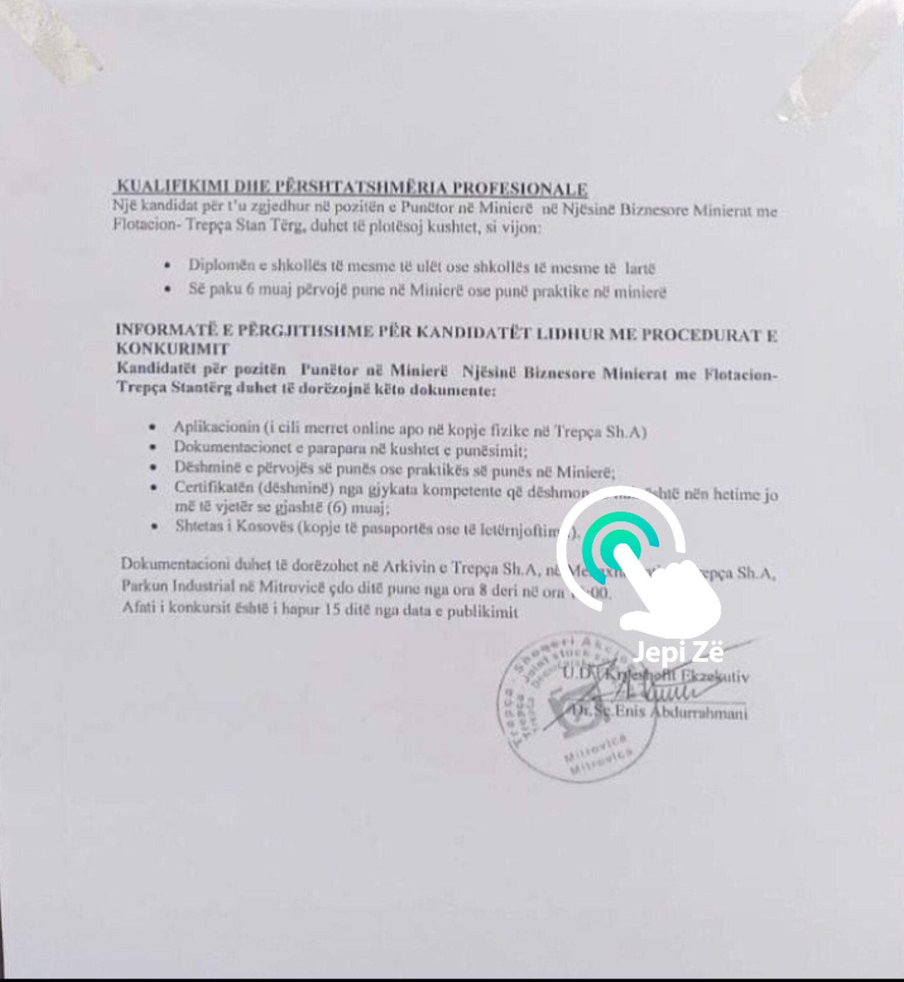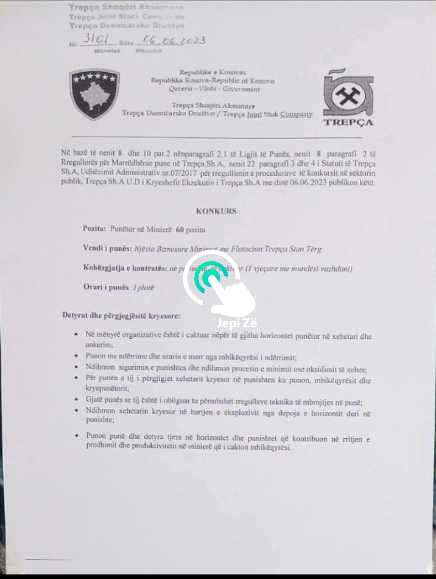 Lajme Trepça hap konkurs për rreth 60 punëtorë June 6, 2023 02 Press Trepça ka hapur rreth 60 vende të lira të punës. Këta punëtorët mund të nënshkruajnë kontratë një vjeçare me mundësi vazhdimi. Sipas kushteve në konkurs, kërkohet që kandidatët të kenë përvojë 6 mujore, ndërsa kjo ju përshtatet më së shumti praktikantëve. Lexo edhe: Burri në Rahovec ngacmon seksualisht një grua, përleshet fizikisht me djalin që i doli nënës së tij në ndihmë