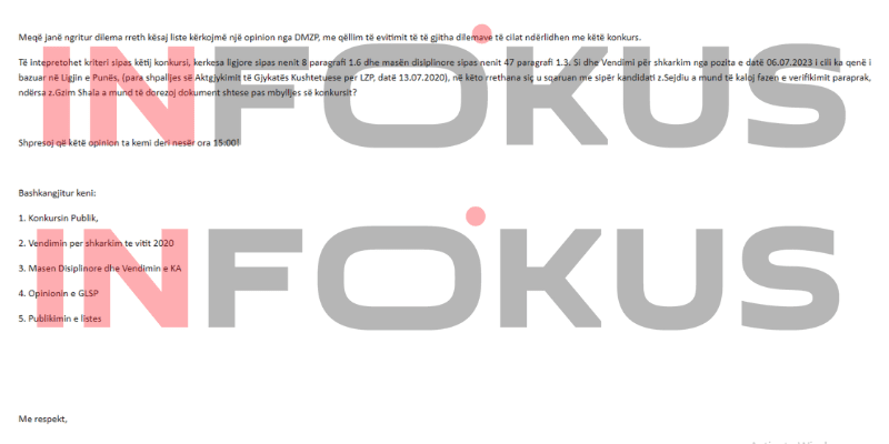 Mirëpo pavarësisht kësaj sërish ishte kërkuar opinioni edhe i këtij departamenti të MPB-së, duke u thirrur në atë se “Meqë janë ngritur dilema rreth kësaj liste kërkojmë një opinion nga DMZP, me qëllim të evitimit të të gjitha dilemave të cilat ndërlidhen me këtë konkurs”.