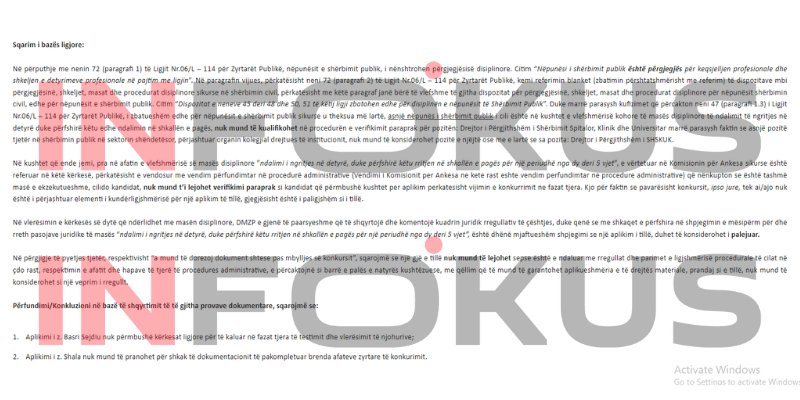 “Pra e kanë nxjerr një opinion përmes të cilit këta tash po ja mohojnë të drejtën me apliku sepse qenka në kundërshtim me ligjin. Për kandidatin tjetër e dimë që ka shërbyer në ministri të Shëndetësisë ma herët. Mirëpo në këtë rast është e thjeshtë sepse ligji është shumë i qartë. Dhe një opinion i MPB-së nuk mund të jetë mbi ligjin por ne do ta ndjekim si rast, sepse kemi dërguar kërkesë në ShSKUK, për qasje në dokumente publike dhe sapo ta marrim qasjen do të paraqesim padi për masën e shtyrjes së vendimit të çfarëdo opinioni ose vendimi po ashtu nëse do të ketë nevojë në procedurë do të bëjmë edhe kallëzim penal. Përderisa zyra e burimeve njerëzore ka thënë se çdo gjë është në rregull që në fakt edhe është në rregull me ligjin atëherë një farë qëllimi tjetër veç po duket këtu. Nuk e di në aspektin politik çfarë mundet me pas por aspekti ligjor është tamam sepse nuk mundet opinioni me qenë mbi ligjin”, ka përfunduar ai.
